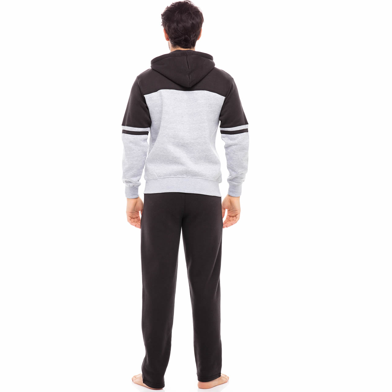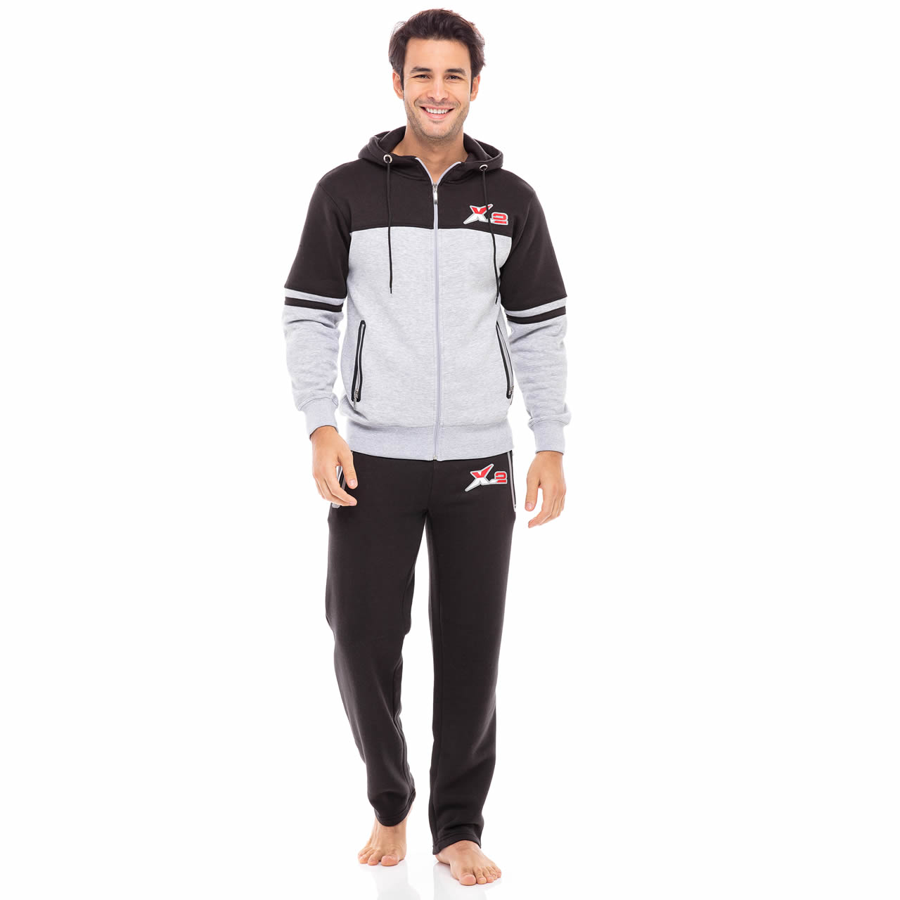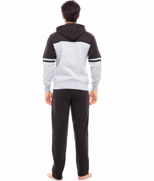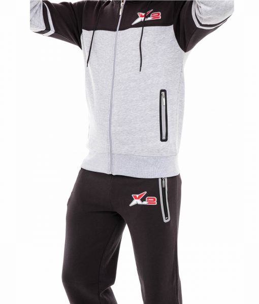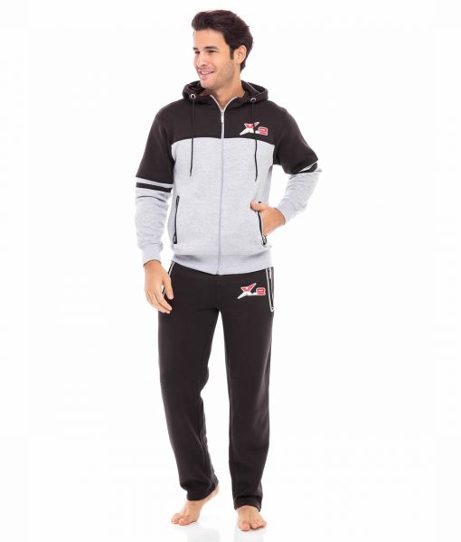 Mens Black–Gray Hooded Athletic Full Zip Fleece X-2 Tracksuit Jogging Sweatsuit